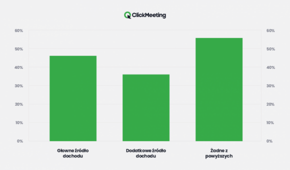 Wiele osób przeniosło swój biznes do świata online. Aż 12% badanych zadeklarowało, że płatne webinaria są dla nich głównym źródłem uzyskania dochodu, jednocześnie potwierdzając, że można utrzymać się z ich prowadzenia. Z kolei aż 32% ankietowanych stwierdziło, że ten rodzaj wydarzeń online jest ich dodatkowym źródłem dochodu. To pokazuje, że łącznie dla 44% organizatorów wydarzeń na badanej platformie ta metoda gwarantuje wpływy do budżetu. Dodatkowo 81% ankietowanych zadeklarowało, że po zakończeniu kwarantanny i zasad dystansu społecznego, nadal będzie używać platform webinarowych.