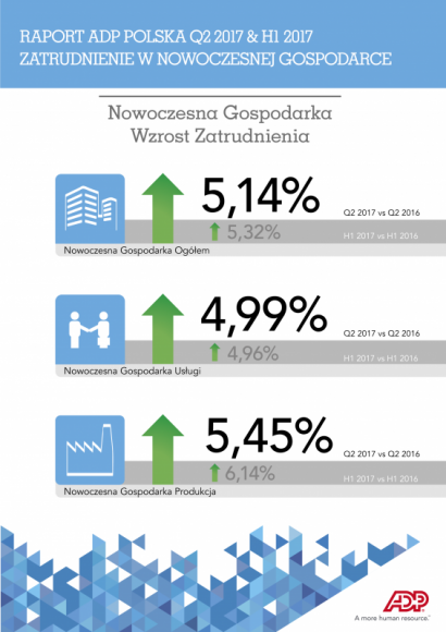 – Wyniki odnotowane przez Nowoczesną Gospodarkę w pierwszym półroczu 2017 r. utwierdzają nas w przekonaniu, że polski rynek pracy zmierza w dobrym kierunku i dynamicznie się rozwija. Wzrost zatrudnienia ogółem, w samym II kw. br. utrzymał wysoki poziom z I kw. i wyniósł +4,5 proc. Awangarda biznesu już tradycyjnie miewa się lepiej. Firmy z sektora Nowoczesnej Gospodarki odnotowały wzrost zatrudnienia w II kw. br. na poziomie +5,14 proc. w porównaniu do analogicznego okresu w roku ubiegłym. Mimo nieznacznego zahamowania, w stosunku do wyników z początku roku, najbardziej innowacyjne firmy wciąż rozwijały się i wdrażały działania usprawniające ich biznes. Bardzo cieszy fakt, że ogół biznesu utrzymuje tendencje wzrostowe i zbliża się do wyniku firm z Nowoczesnej Gospodarki. Jednocześnie odnotowaliśmy rekordowo niskie bezrobocie na poziome 7,1 proc. Z pewnością jest to zasługa m.in. sezonowego zapotrzebowania na pracowników tymczasowych, ale przede wszystkim stale rozwijającej się koniunktury – dodaje Magdalena Dacka, HR Business Partner w ADP Polska.
